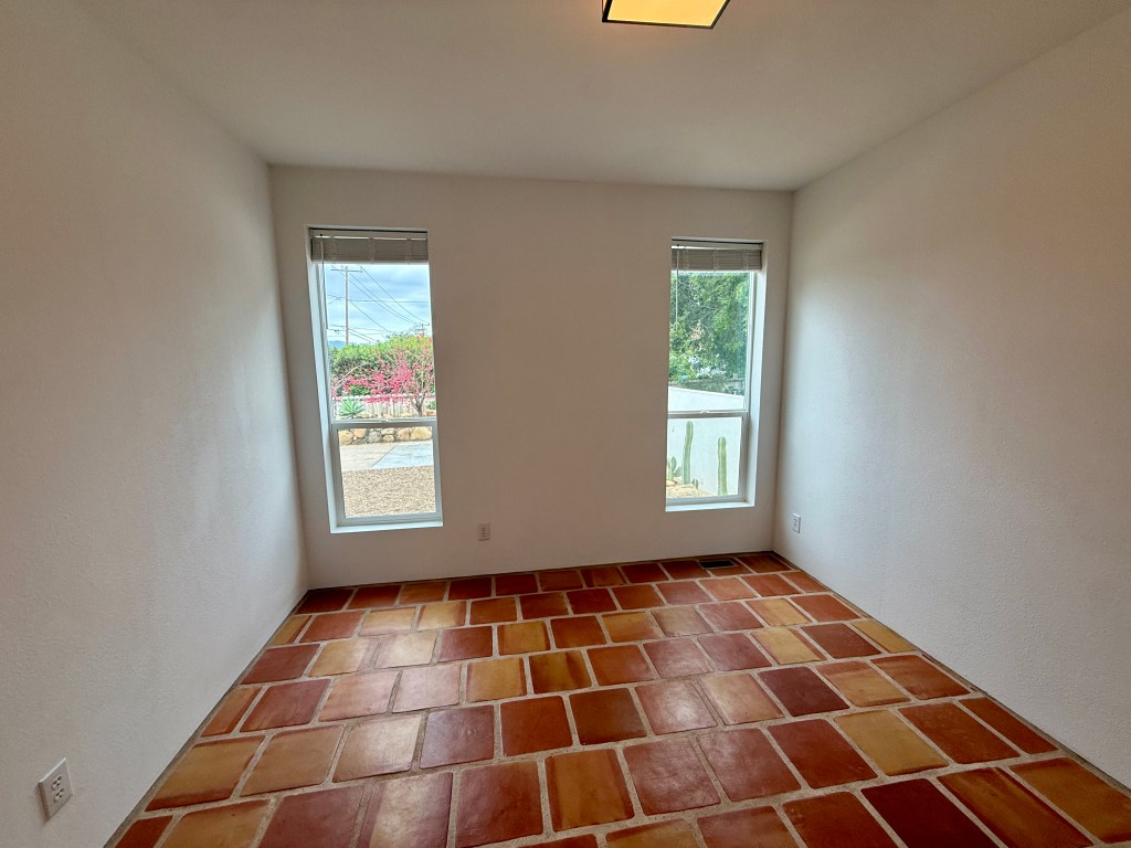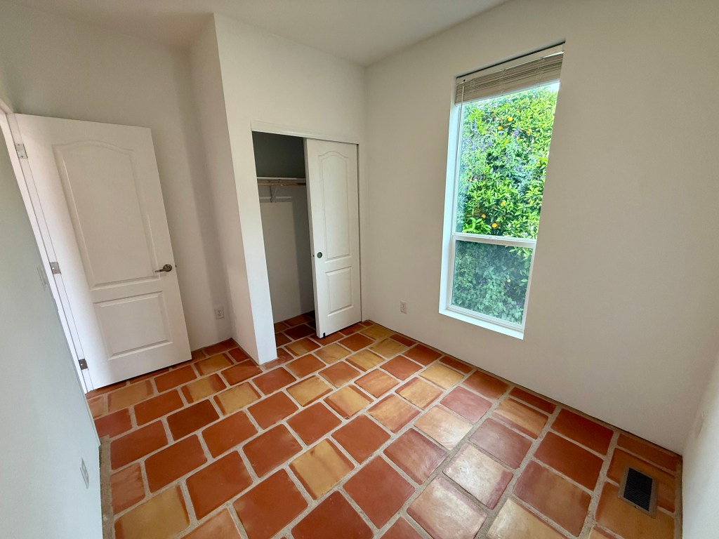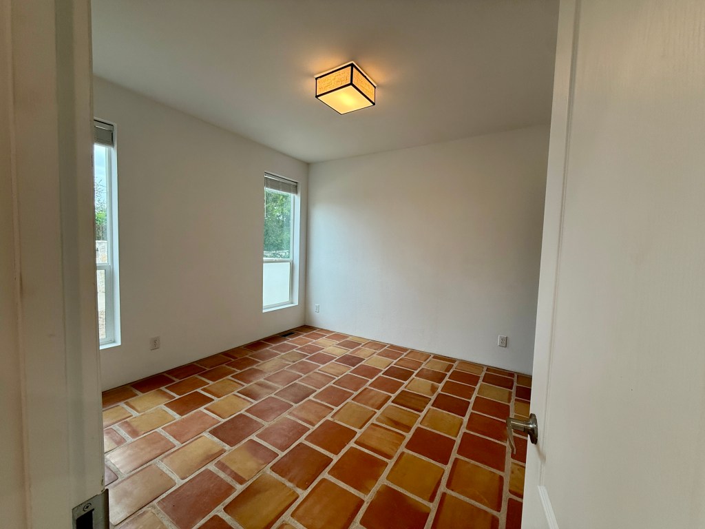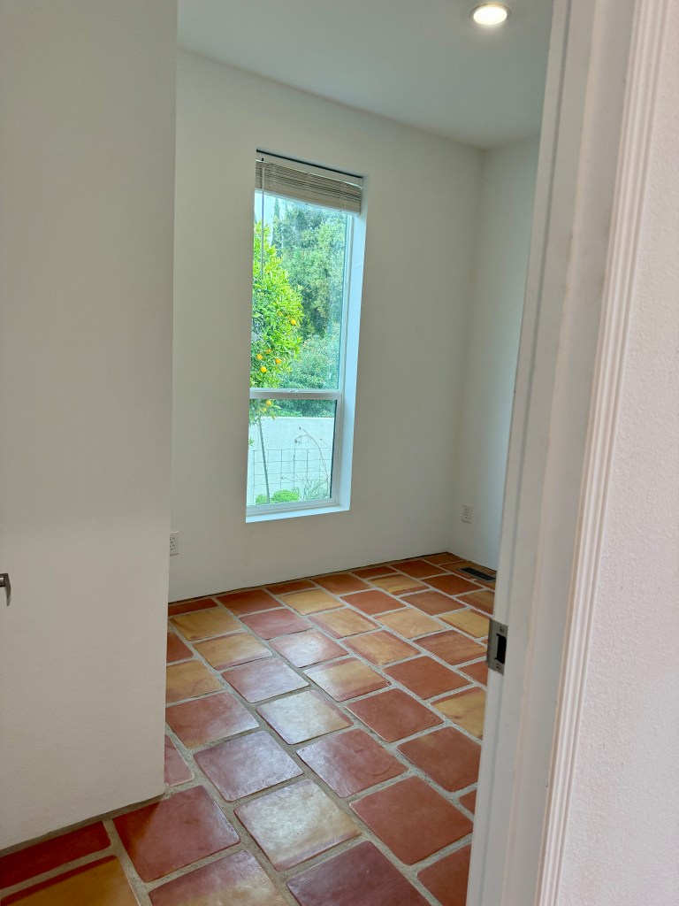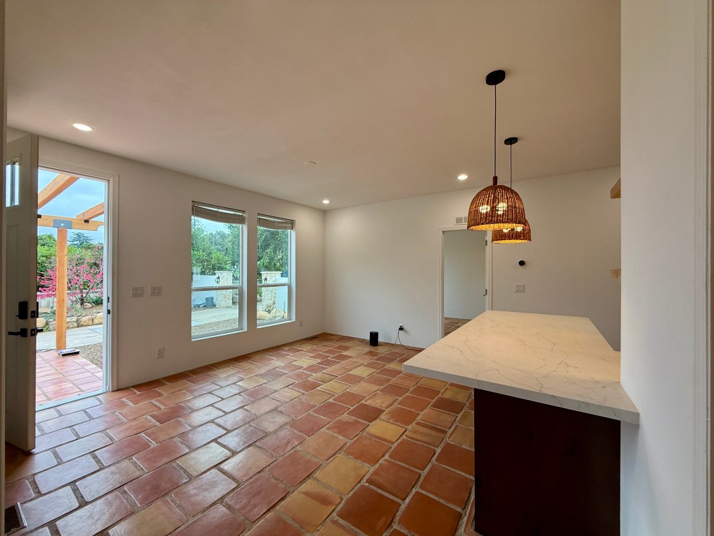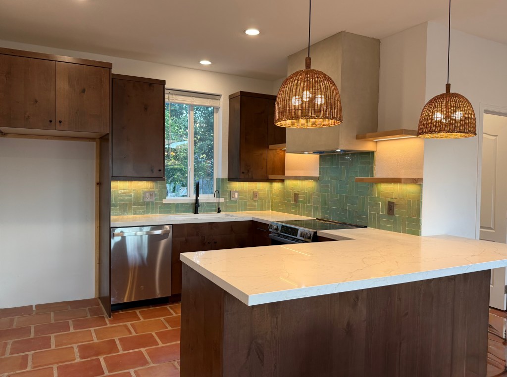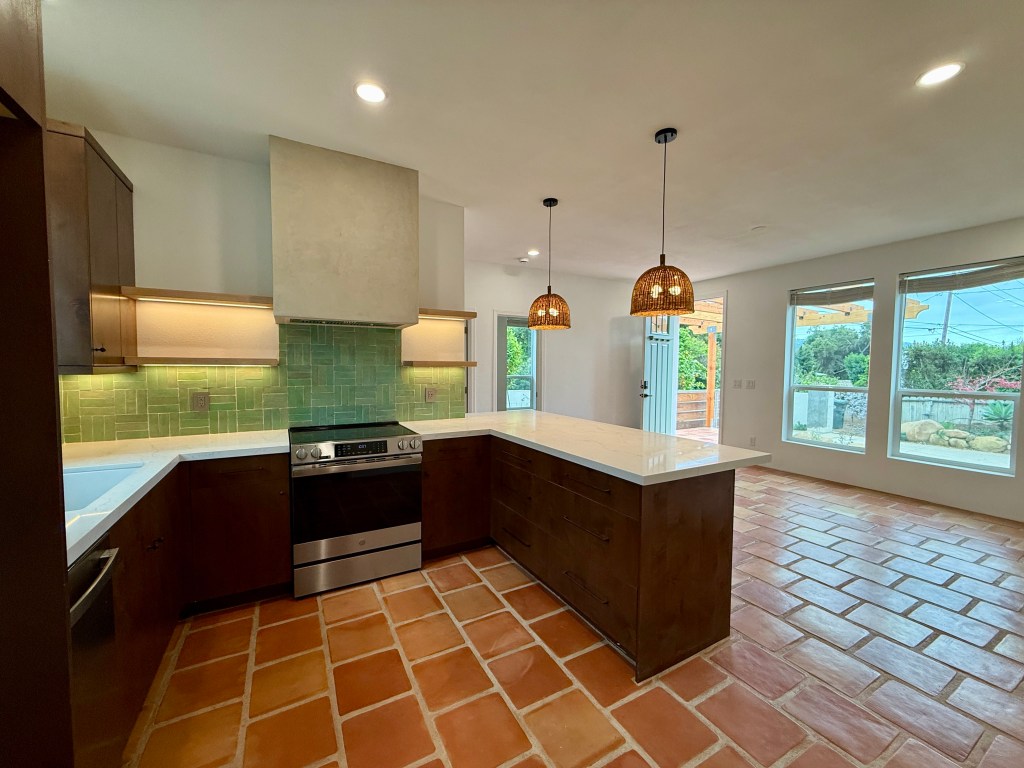 Inside, you’ll find 9-foot ceilings and abundant natural light throughout. The open living area flows into a stylish kitchen featuring quartz countertops, a handcrafted zellige tile backsplash, and custom plaster hood creating a warm, modern Spanish feel. A new central heat pump system provides both heating and air conditioning for efficient year-round comfort.